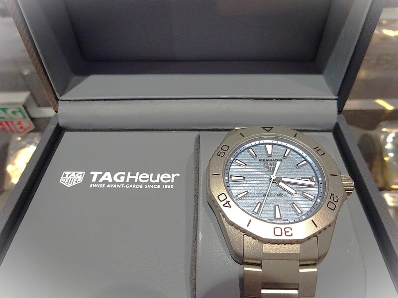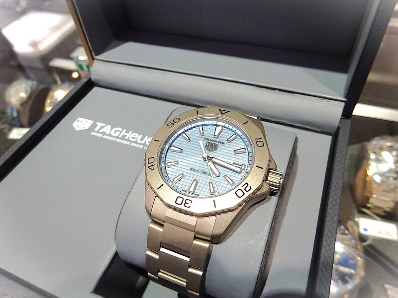 ソーラーグラフ テクノロジー、ソーラー駆動型ムーブマントを取り入れた、ケース径40mmのタグ・ホイヤー アクアレーサー プロフェッショナル200ソーラーグラフです。軽量でスリムなデザインと頑丈なグレード2チタンのウォッチです。文字盤の水色とチタンの渋い色合いがとてもカッコ良い時計です。